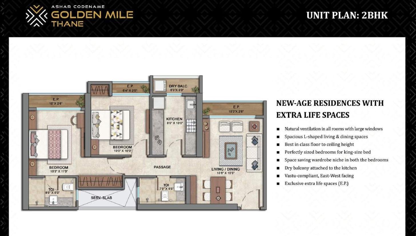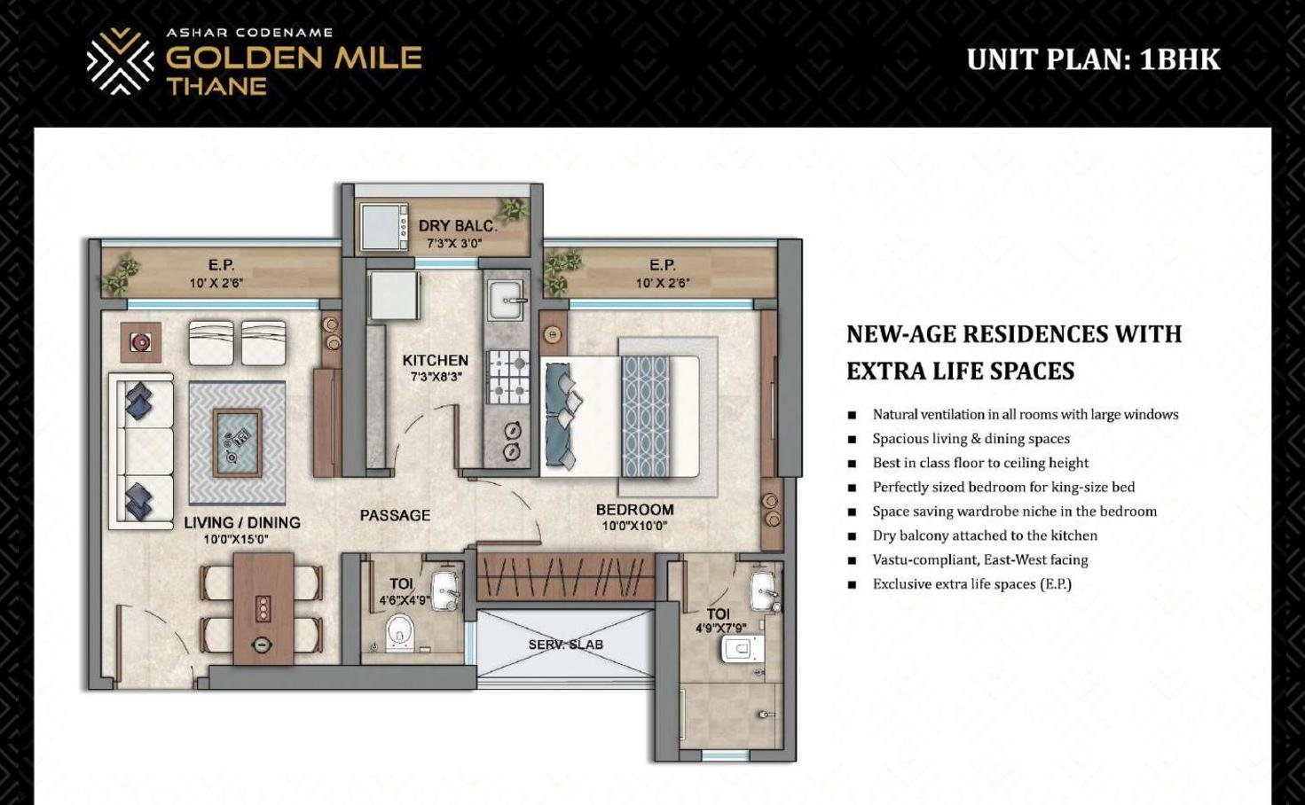 Ashar Codename Golden Mile is a project by ashar group situated in the heart of Thane. Consisting of 1 & 2 BHK apartments goes up to 33 floors. Ashar Codename Golden Mile is the first project in Ashar's Igreen series that aims to bring the future of living. This means creating homes with advanced features that enhance the quality of life In the heart of smart Thane, Ashar Codename Golden Mile will rise above the properties that surround it, And that's not just because this 1 & 2 BHK Project goes up to 33 floors. Ashar Codename Golden Mile is the first project in our iGreen series that aims to bring the future of living to you. This means creating homes with advanced features that enhance your quality of life.
